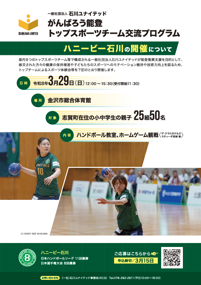 本取組みでは、志賀町在住の小中学生の親子25組50名様をホームゲームにご招待し、ハンドボール教室も実施いたします。
